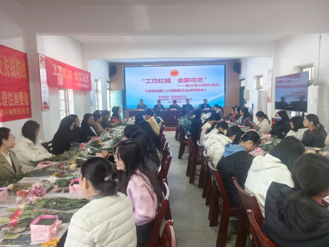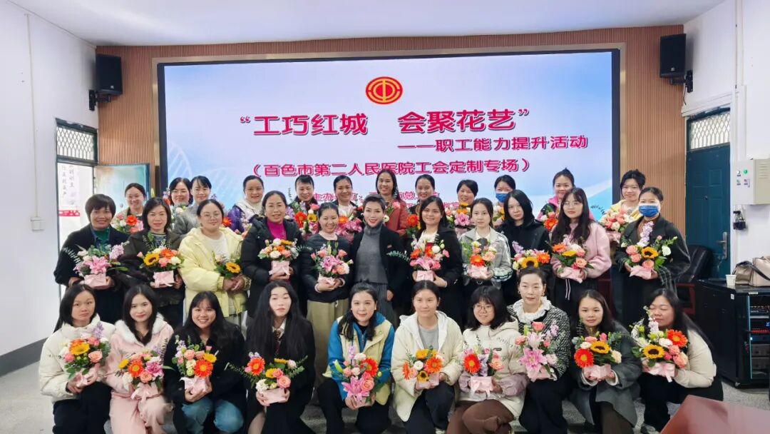 为丰富职工文化生活,提升职工审美素养与生活品味,11月28日上午,由百色市总工会主办、百色市第二人民医院工会、中国建设银行百色向阳分行协办的“工巧红城 会聚花艺”职工技能提升培训活动在我院总院二楼会议室举行。来自医院各科室的50余名职工齐聚一堂,共赴一场与鲜花的浪漫之约。